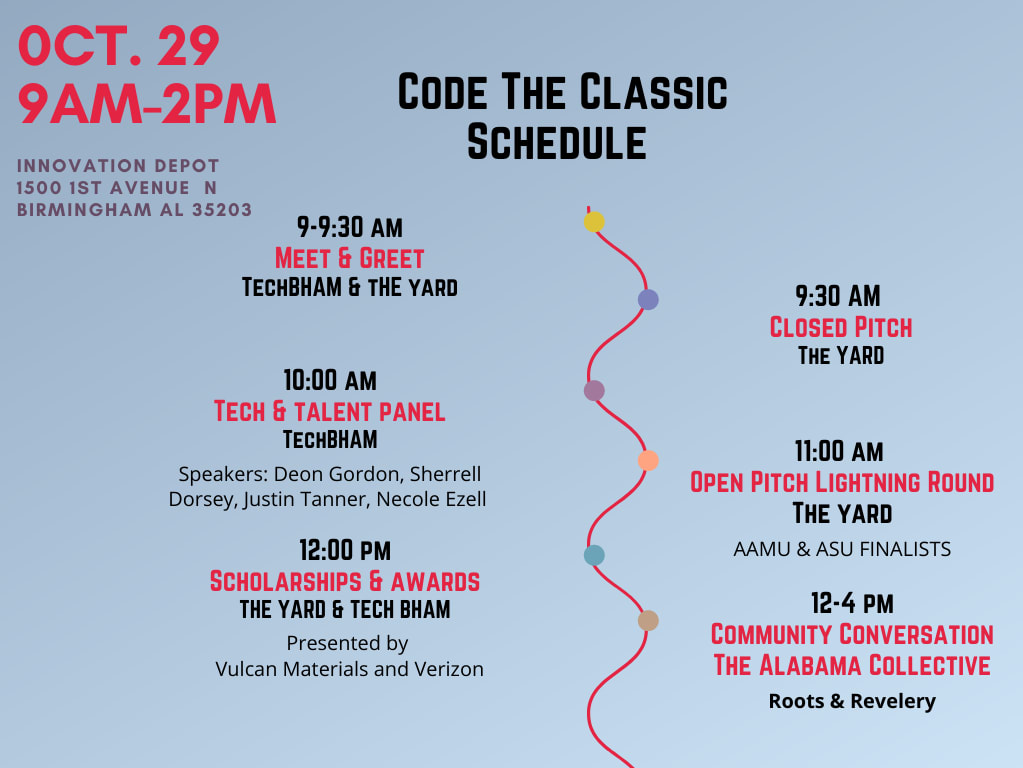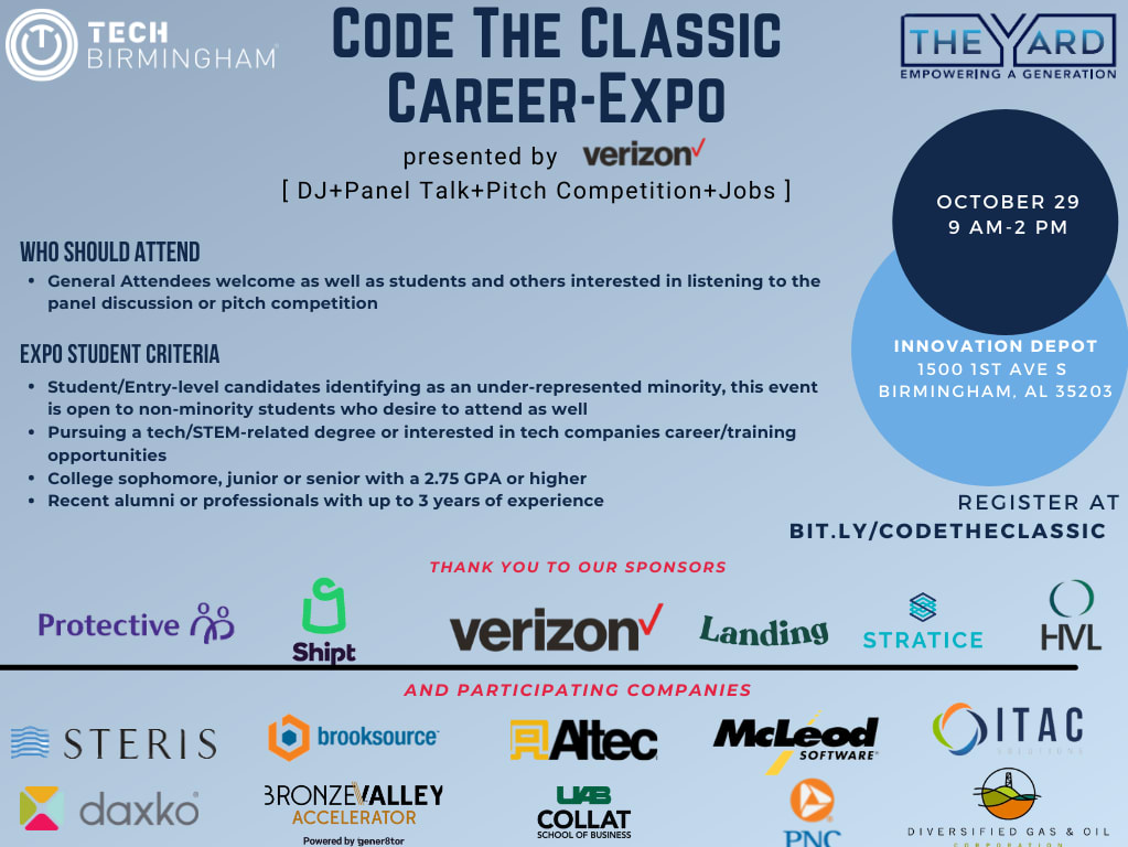 TechBirmingham and Verizon would love to invite you to our annual Code The Classic Career Expo at Innovation Depot October 29th from 9am-2pm! This is a full day of programming with recruitment, a pitch competition in partnership with TheYardTour and Vulcan Materials, and two speaker sessions - one on recruiting and retaining diverse tech talent with a special guest moderator in the Velocity room. Our job seekers are invited students from local HBCU's and students from other institutions such as UAB and Samford University. Please let us know if you are interested in recruiting some of Birmingham's amazing talent, have any questions, or are interested in our sponsorship opportunities at stephanie@techbirmingham.com.