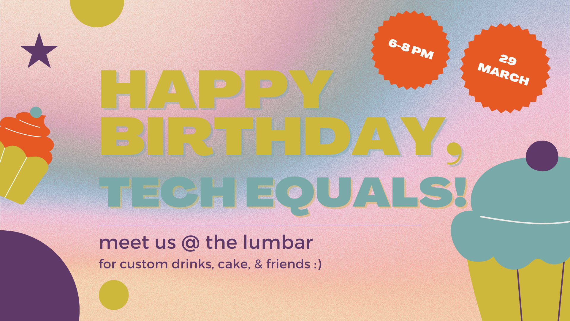 Tech Equals is turning 1, and we're hosting a party you won't want to miss. Join us at The Lumbar (queer-owned!), on Wednesday, March 29th, from 6-8pm to celebrate our 1st birthday in style. Allies encouraged to join!!