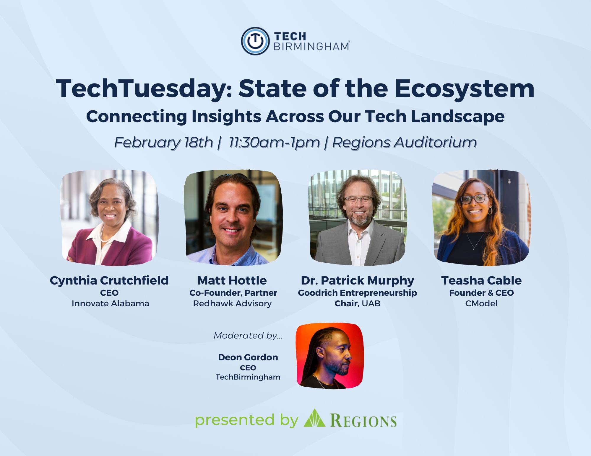 Join us for our first TechTuesday luncheon of the year, featuring a compelling State of the Ecosystem discussion. This conversation will take the pulse of our ecosystem, exploring where our tech scene is at today and where it's headed. Panelists will share insights from a range of perspectives, including those of a founder, funder, ecosystem-building leader, and education expert. Together, they'll dive into key challenges, opportunities, and emerging trends shaping our tech community.