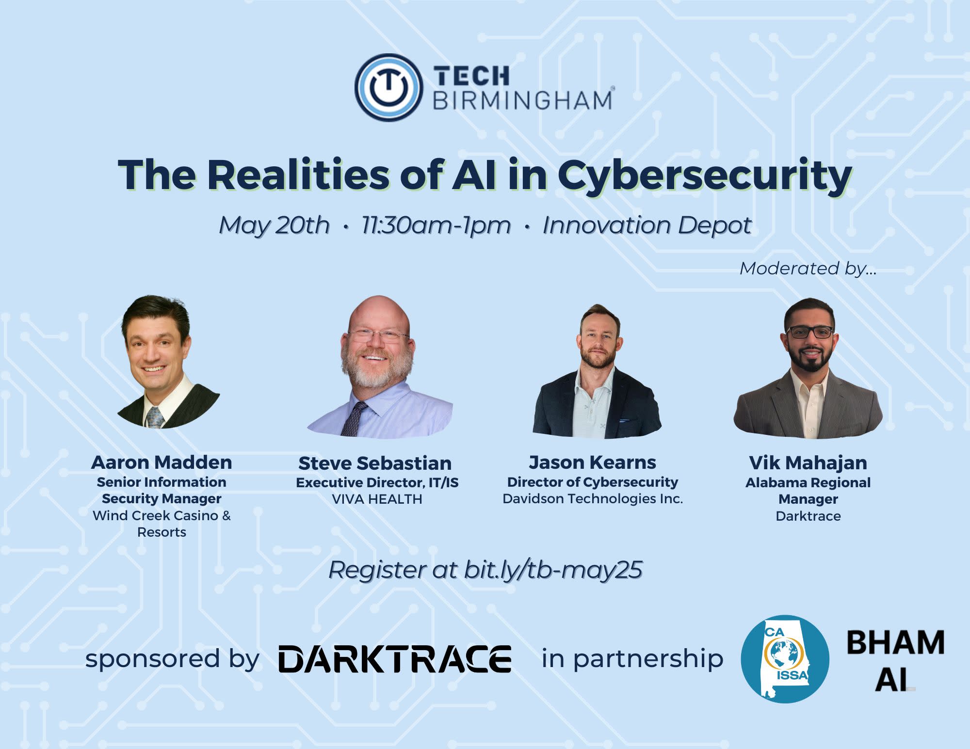 Moderator: Vik Mahajan (Miami) – Alabama Regional Manager at Darktrace, AI cybersecurity expert and MIT-certified in AI design, with experience across multiple industries and active in the Alabama ISSA chapter.